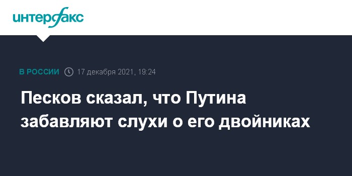 Москва. 17 декабря. INTERFAX.RU - Президент Владимир Путин знает, что существует "теория двойников", по которой на разных мероприятиях его могут заменять двойники. Об этом пресс-секретарь президента Дмитрий Песков сказал в интервью телеканалу RTVI.