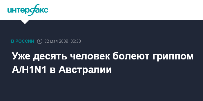 Лондон. 22 мая. ИНТЕРФАКС - В Австралии число заболевших гриппом А/Н1N1 достигло десяти человек. Таковы данные министерства здравоохранения страны.
