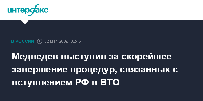Москва. 22 мая. INTERFAX.RU - Президент РФ Дмитрий Медведев на саммите Россия-Евросоюз в Хабаровске поставил перед европейскими партнерами вопрос о скорейшем завершении всех процедур, связанных с вступлением России в ВТО. По словам Н.Тимаковой, Д.Медведев "подтвердил готовность к выполнению Россией всех взятых на себя обязательств в рамках ВТО". "Россия выполнила все взятые на себя ранее обязательства, и в случае принятия в ВТО, будет готова выполнить все оставшиеся требования", - сказала пресс-секретарь президента.