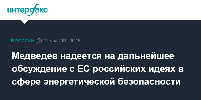 Москва. 22 мая. INTERFAX.RU - Президент России Дмитрий Медведев считает, что руководство Евросоюза проявили интерес к инициативе РФ о создании новой правовой базы международного сотрудничества в сфере энергетики.