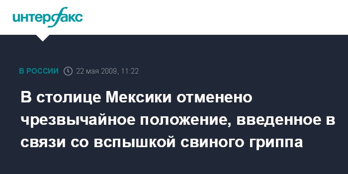 Москва. 21 мая. INTERFAX.RU – Власти столицы Мексики в четверг объявили об отмене режима чрезвычайного положения, введенного в городе 23 апреля в связи со вспышкой вируса гриппа A/H1N1.