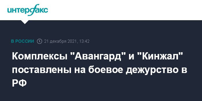 Москва. 21 декабря. INTERFAX.RU - Комплексы "Авангард" и "Кинжал" поставлены на боевое дежурство, заявил президент РФ Владимир Путин.
