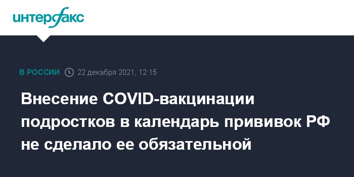 Москва. 22 декабря. INTERFAX.RU - Включение вакцинации подростков от 12 до 17 лет от коронавируса в календарь профилактических прививок по эпидемическим показаниям не делает ее обязательной, по российскому законодательству их иммунизация возможна лишь при добровольном письменном согласии законных представителей, сообщил в среду помощник главы Минздрава РФ Алексей Кузнецов.