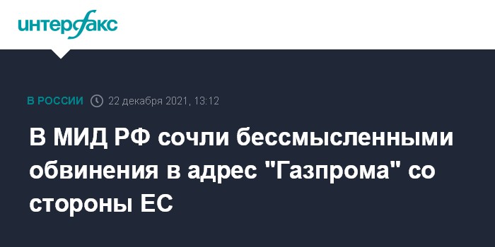 Москва. 22 декабря. INTERFAX.RU - Обвинения со стороны ЕС в адрес "Газпрома" в том, что он ограничивает поставки газа в Европу, бессмысленные и бессодержательные. Об этом "Интерфаксу" заявил замглавы МИД РФ Александр Грушко.