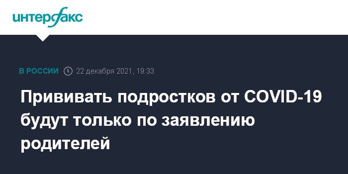 Москва. 22 декабря. INTERFAX.RU - В России подростков в возрасте от 12 до 17 лет прививать от коронавируса будут только по письменному заявлению родителей, заявила главный внештатный детский специалист по профилактической медицине Минздрава, академик РАН Лейла Намазова-Баранова.