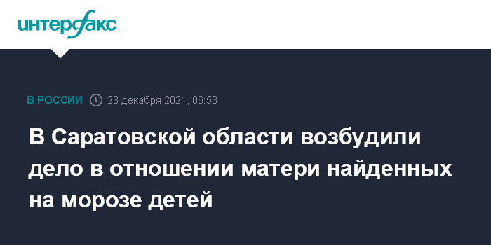 Москва. 23 декабря. INTERFAX.RU - Следственные органы Саратовской области возбудили уголовное дело в отношении матери пострадавших от переохлаждения двоих детей в селе Прокудино Аткарского района, женщина задержана, сообщается на сайте СУ СКР по региону.