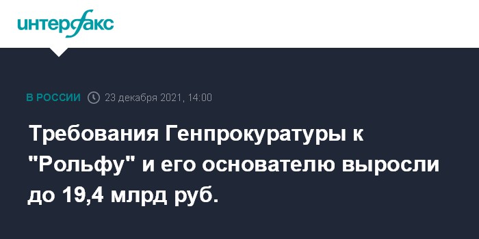 Москва. 23 декабря. INTERFAX.RU - Генеральная прокуратура РФ более чем на 6,5 млрд рублей увеличила требования к автодилеру "Рольф" и основателю компании Сергею Петрову по иску об обращении средств в доход государства.