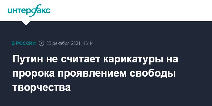 Москва. 23 декабря. INTERFAX.RU - Президент Владимир Путин не считает, что оскорбление пророка Мухаммеда - это проявление свободы творчества, такие оскорбления он считает нарушением свободы вероисповедания и нарушением святых чувств мусульман.