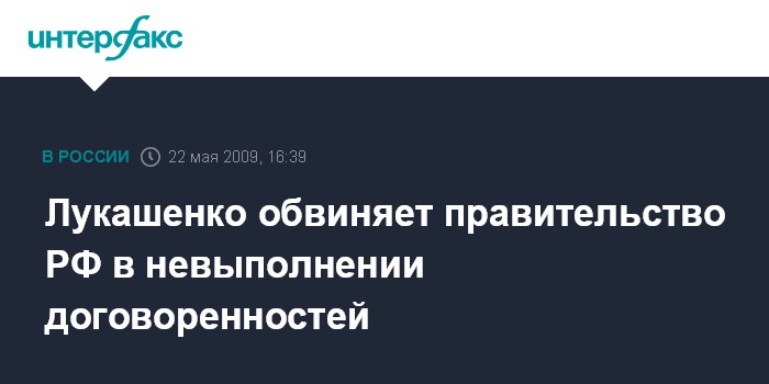 Шклов. 22 мая. INTERFAX.RU - Президент Белоруссии Александр Лукашенко считает, что в срыве договоренностей в рамках союзного государства виновато российское правительство.