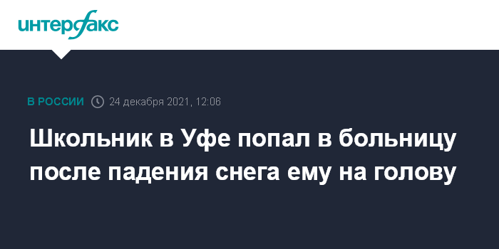 Москва. 24 декабря. INTERFAX.RU - В Уфе с балкона многоквартирного дома снег упал на голову 11-летнему школьнику, который утром 23 декабря шел в школу. Ребенка попал в больницу с травмой головы, сообщила пресс-служба прокуратуры Башкирии в пятницу.