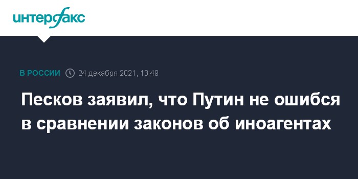 На брифинге 24 декабря журналист "Медузы" (признана в России СМИ-иноагентом) сказал, что на пресс-конференции в четверг Путин сказал, что американский закон об иноагентах, в котором предусмотрена уголовная ответственность за нарушения и до пяти лет лишения свободы, жестче российского, поскольку российский закон такой ответственности не предусматривает. Журналист напомнил, что в российском законодательстве за злостное уклонение от исполнения функций иностранного агента физлицу грозит до двух лет тюрьмы, а руководителю - до пяти лет.