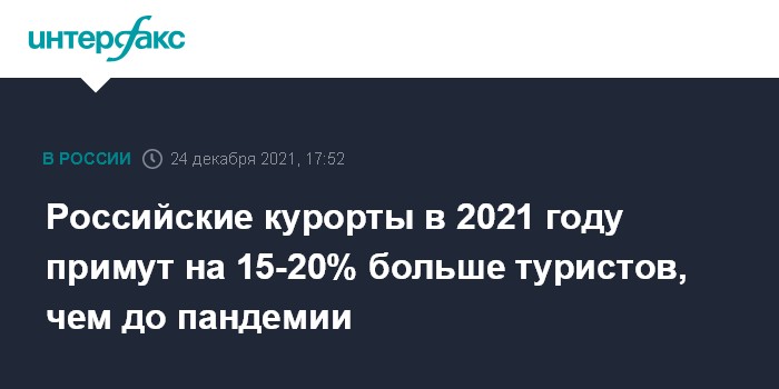 Москва. 24 декабря. INTERFAX.RU - Российские курорты по итогам 2021 года примут на 15-20% больше туристов, чем в допандемийном 2019 году. Об этом сообщил вице-премьер правительства РФ Дмитрий Чернышенко на совещании правительственной комиссии по развитию туризма.