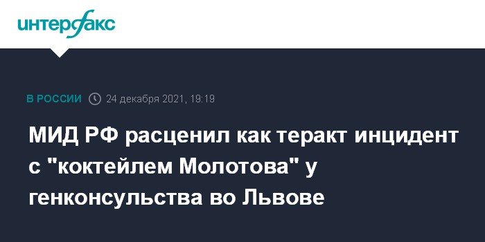 "Сегодня, 24 декабря в 02:30 ночи по местному времени против Генерального консульства России во Львове был совершен террористический акт. Неизвестный бросил в направлении входа на территорию учреждения бутылку с зажигательной смесью, которая воспламенилась и создала угрозу безопасности загранучреждения. По счастливой случайности никто из сотрудников не пострадал", - заявили на Смоленской площади.