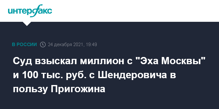 "По итогу суд признал оспариваемые сведения в отношении Евгения Викторовича недостоверными и порочащими, обязал ответчиков удалить и опровергнуть их, взыскал компенсацию морального вреда с Шендеровича – 100 000 рублей, с ЗАО "Эхо Москвы" – 1 000 000 рублей, а также установил судебную неустойку за неисполнение судебного акта в размере 1 000 рублей в день", - сообщает компания "Пригожина "Конкорд" в пятницу.