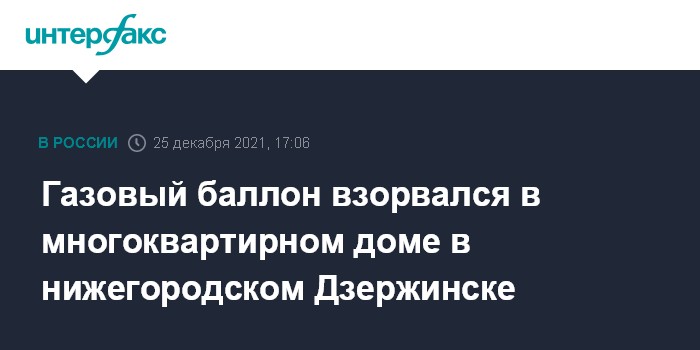 Москва. 25 декабря. INTERFAX.RU - Взрыв газового баллона произошел в квартире жилого дома в городе Дзержинске Нижегородской области.