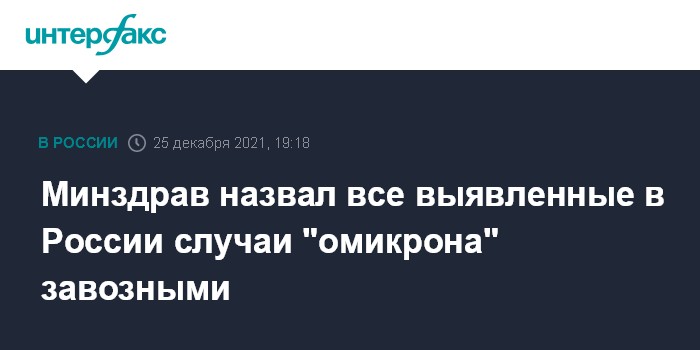 Москва. 25 декабря. INTERFAX.RU - Все выявленные на данный момент в России случаи заражения штаммом коронавируса "омикрон" являются завозными, сообщила в субботу пресс-служба Минздрава РФ.