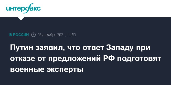 Москва. 26 декабря. INTERFAX.RU - Военно-технический ответ РФ в случае отказа США и НАТО рассматривать российские предложения в сфере безопасности может быть разным, соответствующие предложения подготовят военные эксперты, заявил президент РФ Владимир Путин.