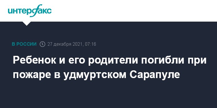 Москва. 27 декабря. INTERFAX.RU - Следователи управления СКР по Удмуртии возбудили уголовное дело по факту гибели трех человек при пожаре в городе Сарапуле в ночь на понедельник, сообщили "Интерфаксу" в пресс-службе управления.