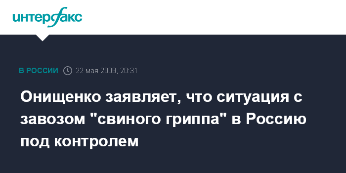 Москва. 22 мая. INTERFAX.RU - Российская санитарная служба принимает все необходимые меры для выявления возможных случаев завоза опасного гриппа A/H1N1 "Калифорния", заявил руководитель Роспотребнадзора, главный государственный санитарный врач РФ Геннадий Онищенко.