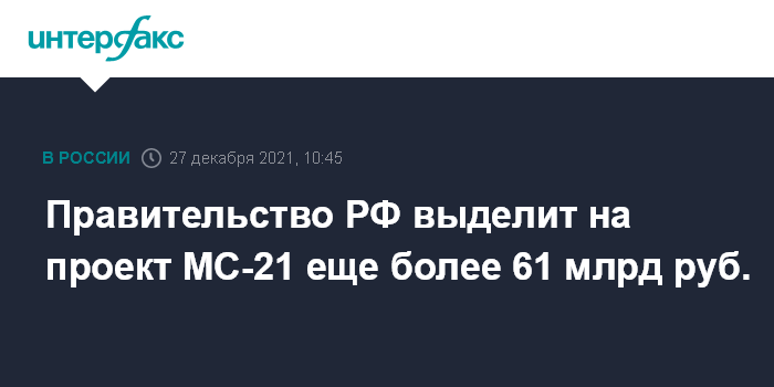 Москва. 27 декабря. INTERFAX.RU - Правительство РФ выделит на проект создания гражданского самолета МС-21 еще более 61 млрд рублей, сообщил премьер-министр Михаил Мишустин.