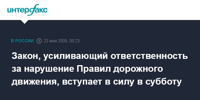 "Федеральный закон "О внесении изменений в Кодекс Российской Федерации об административных правонарушениях" (КоАП), который был подписан президентом РФ Дмитрием Медведевым 8 мая и опубликован 12 мая, вступит в силу в субботу, 23 мая", - сказал представитель ДОБДД "Интерфаксу" в пятницу.