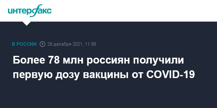 Москва. 28 декабря. INTERFAX.RU - В России первую дозу вакцины от коронавируса получили уже более 78 млн человек, сообщил телеканалу "Россия 24" министр здравоохранени Михаил Мурашко.