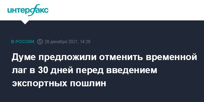 Москва. 28 декабря. INTERFAX.RU - Правительство внесло в Госдуму законопроект №48134-8, который снимает существующий сейчас обязательный период подготовки бизнеса в 30 дней между изданием постановления правительства о введении экспортных пошлин на какие-либо товары и началом действия новых пошлин.