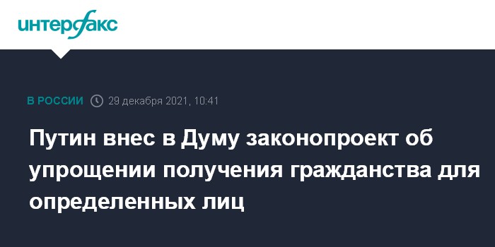 Согласно документу (49269-8), размещенному в базе законодательной деятельности нижней палаты парламента РФ, предлагается расширить полномочия главы государства по определению категорий лиц, которые имеют право на упрощенное приобретение гражданства РФ.