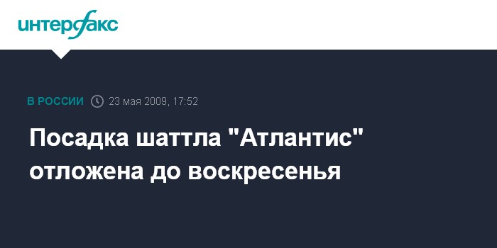 Москва. 23 мая. INTERFAX.RU - Посадка шаттла "Атлантис" из-за неблагоприятных погодных условий над штатом Флорида перенесена на воскресенье, сообщили "Интерфаксу-АВН" в субботу в подмосковном Центре управления полетами.