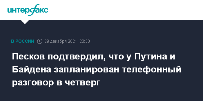 Москва. 29 декабря. INTERFAX.RU - Пресс-секретарь президента РФ Дмитрий Песков подтвердил "Интерфаксу", что Владимир Путин планирует в четверг поговорить по телефону с президентом США Джо Байденом.