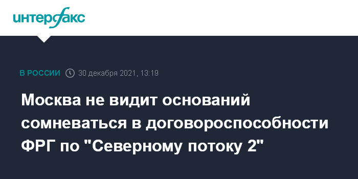 Москва. 30 декабря. INTERFAX.RU - У Москвы пока нет оснований сомневаться в договороспособности ФРГ относительно "Северного потока 2", заявила официальный представитель МИД РФ Мария Захарова.