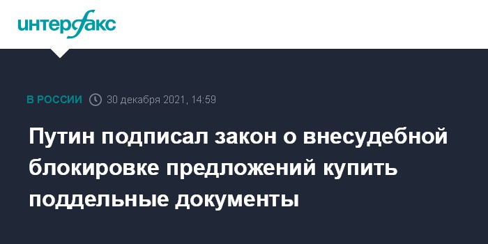 Москва. 30 декабря. INTERFAX.RU - Президент Владимир Путин подписал закон о досудебном ограничении доступа к сайтам, где продают поддельные документы. Закон опубликован на официальном портале правовой информации.