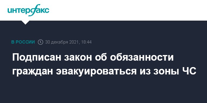Москва. 30 декабря. INTERFAX.RU - Президент Владимир Путин подписал закон, который обяжет граждан уезжать из зоны чрезвычайной ситуации, если будет объявлена эвакуация. Закон опубликован на официальном портале правовой информации.