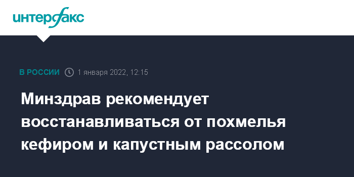 Москва. 1 января. INTERFAX.RU - Посленовогоднее похмелье не следует снимать новыми дозами алкоголя, восстановлению организма помогут кефир, бульоны и капустный рассол, напомнил главный внештатный нарколог Минздрава РФ Евгений Брюн.