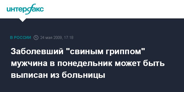 Москва. 24 мая. INTERFAX.RU - Москвич, у которого был обнаружен вирус A1/H1N1, может быть выписан из 1-ой клинической инфекционной больницы уже в понедельник, сообщил в воскресенье "Интерфаксу" источник в медицинских кругах столицы.