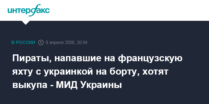 Киев. 8 апреля. INTERFAX.RU - Из французских дипломатических источников стало известно, что пираты, захватившие французскую яхту "Le Ponant" ("Зефир") с гражданкой Украины на борту, не выдвигают никаких требований террористического направления. Пиратское нападение на французскую яхту мотивируется исключительно финансовыми интересами, сообщает министерство иностранных дел Украины во вторник со ссылкой на информацию посольства Украины во Франции.