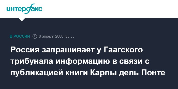 Москва. 8 апреля. ИНТЕРФАКС - Россия обратилась в Международный трибунал по бывшей Югославии (МТБЮ) с запросом информации о преступлениях против косовских сербов в связи с публикацией мемуаров бывшего прокурора трибунала Карлы дель Понте.