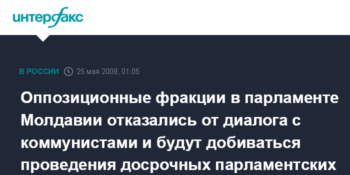 Кишинев. 25 мая. ИНТЕРФАКС - Оппозиционные фракции в парламенте Молдавии отказались от диалога с Партией коммунистов и намерены бойкотировать выборы президента страны, добиваясь тем самым проведения досрочных парламентских выборов. Об этом заявили лидеры трех фракций.
