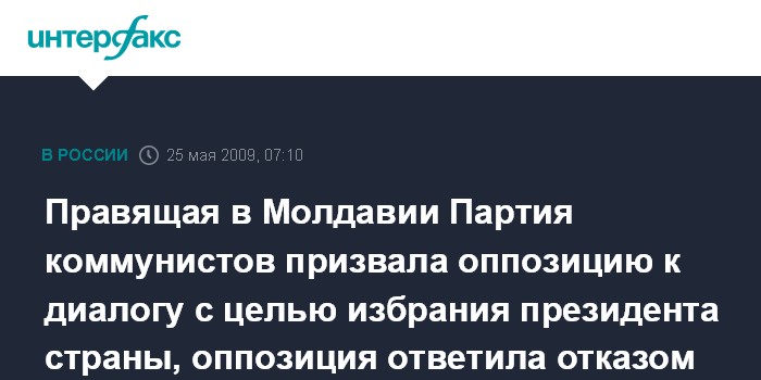 Кишинев. 25 мая. ИНТЕРФАКС - Правящая в Молдавии Партия коммунистов (ПКРМ) призвала оппозицию начать диалог с целью избрания президента страны и заявила о своей решимости преодолеть "крайне непростой политический кризис, который возник в стране после выборов в парламент республики".