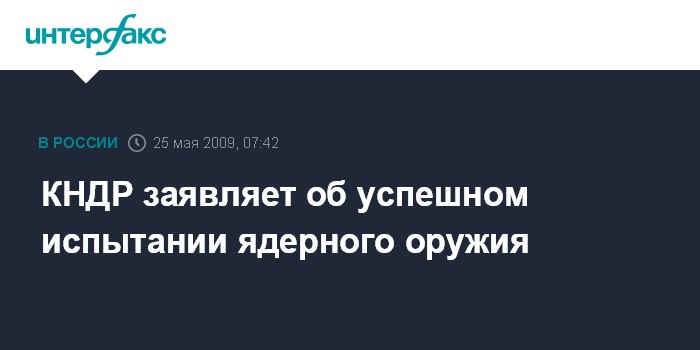Москва. 25 мая. ИНТЕРФАКС - Государственное информационное агентство КНДР ЦТАК сообщило об успешном испытании утром в понедельник ядерного оружия, которое позволило увеличить разрушительную мощность бомбы и уровень контроля над ядерным оружием.