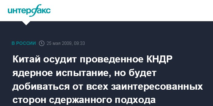 Москва. 25 мая. INTERFAX.RU - Китай в ближайшее время осудит ядерное испытание, проведенное КНДР, заявил агентству "Интерфакс-Китай" близкий к правительственным кругам информированный китайский источник.