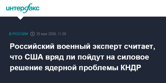 Москва. 25 мая. INTERFAX.RU - Использование силовых методов в решении северокорейской ядерной проблемы со стороны США, Японии или Южной Кореи вряд ли возможно, считает руководитель российского Научно-инновационного центра ракетно-космических технологий генерал-лейтенант Василий Лата.