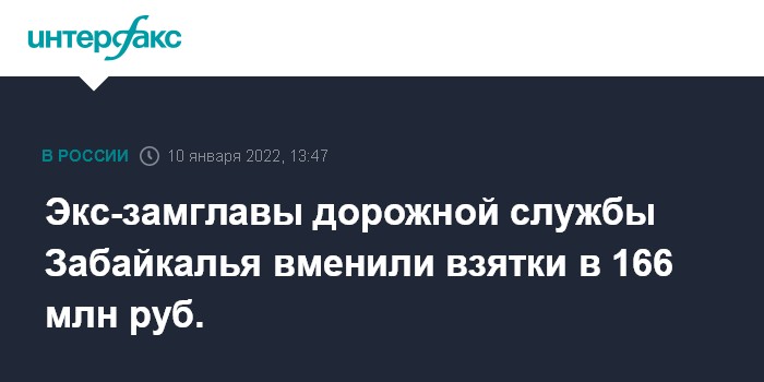 Москва. 10 января. INTERFAX.RU - Общая сумма взяток, полученных бывшим замглавы филиала Росавтодора в Забайкальском крае от коммерсантов при обустройстве дорог, превысила 166 млн рублей. Об этом сообщает региональное следственное управление СК России по итогам расследования уголовного дела.