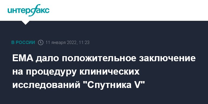 Москва. 11 января. INTERFAX.RU - Специалисты Европейского агентства лекарственных средств (EMA) в ходе визита в Россию дали положительное заключение по процедуре проведения клинических исследований вакцины против коронавируса "Спутник V", сообщил во вторник заместитель главы центра имени Гамалеи Денис Логунов.