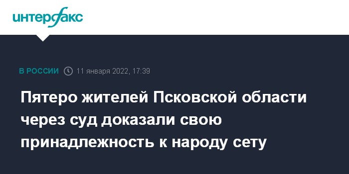 Москва. 11 января. INTERFAX.RU - Псковский районный суд рассмотрел гражданское дело по заявлению пятерых местных жителей об установлении факта их принадлежности к народу сету и принял решение в пользу заявителей, сообщает во вторник объединенная пресс-служба судов Псковской области.