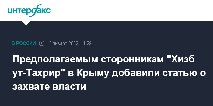 Москва. 12 января. INTERFAX.RU - Пятеро жителей Крымского полуострова, подозреваемых в участии в деятельности террористической организации "Хизб ут-Тахрир" (запрещена в РФ), стали фигурантами нового уголовного дела о приготовлении к насильственному захвату власти. Об этом сообщили в среду в УФСБ России по Крыму и Севастополю.