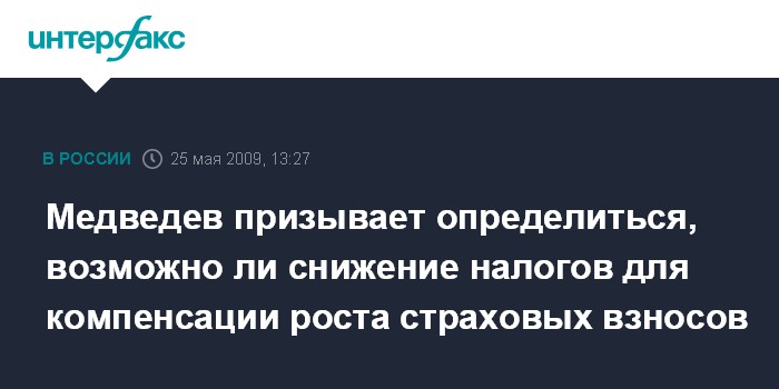 Москва. 25 мая. INTERFAX.RU - Президент РФ Дмитрий Медведев на совещании с членами правительства, посвященном основным положениям Бюджетного послания, призвал определиться, возможно ли снижение налогов для компенсации роста страховых взносов.