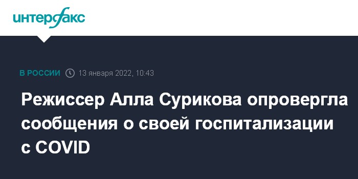 Москва. 13 января. INTERFAX.RU - Режиссер, народная артистка РФ Алла Сурикова опровергла сообщения СМИ о своей госпитализации с коронавирусом.