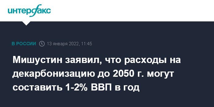 Москва. 13 января. INTERFAX.RU - Ежегодные расходы России по снижению углеродного следа, по предварительной оценке, могут составить от 1 до 2% ВВП на горизонте до 2050 года, заявил глава правительства Михаил Мишустин, выступая с приветственным словом на XIII Гайдаровском форуме - Международной научно-практической конференции "Россия и мир: приоритеты".