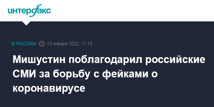 Москва. 13 января. INTERFAX.RU - Премьер-министр РФ Михаил Мишустин поблагодарил российские СМИ за то, что в 2021 году они боролись с фейками на тему коронавируса и помогали людям получить достоверную информацию о болезни.